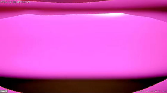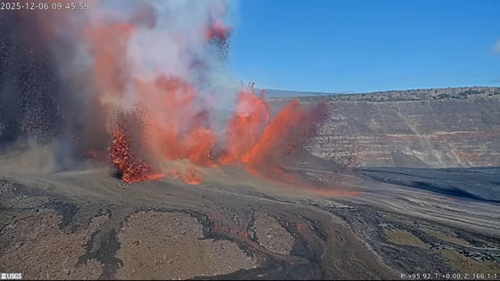 ハワイ火山国立公園に設置されたウェブカメラが撮影した、キラウエア火山から溶岩が噴出する様子を収めた映像がコレ。撮影時間は2025年12月6日10時22分37秒です。