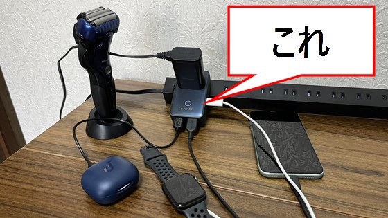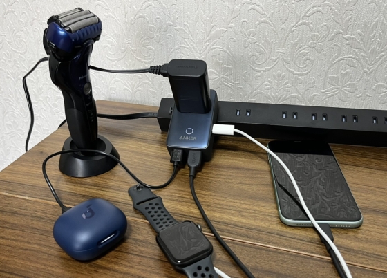 ワイヤレスイヤホンとiPhone、Apple Watch、電動シェーバー程度であれば正常に充電できたので、海外旅行や海外出張で持っていく小型機器類を夜寝ている間に充電しておくような使い方であれば問題なさげ。なお、「Anker Nano トラベルアダプタ(5-in-1,20W)」に変圧機能は付いていないため、海外の電圧に対応していない機器を使用する場合に別途変圧器が必要な点は注意が必要です。