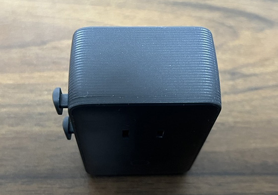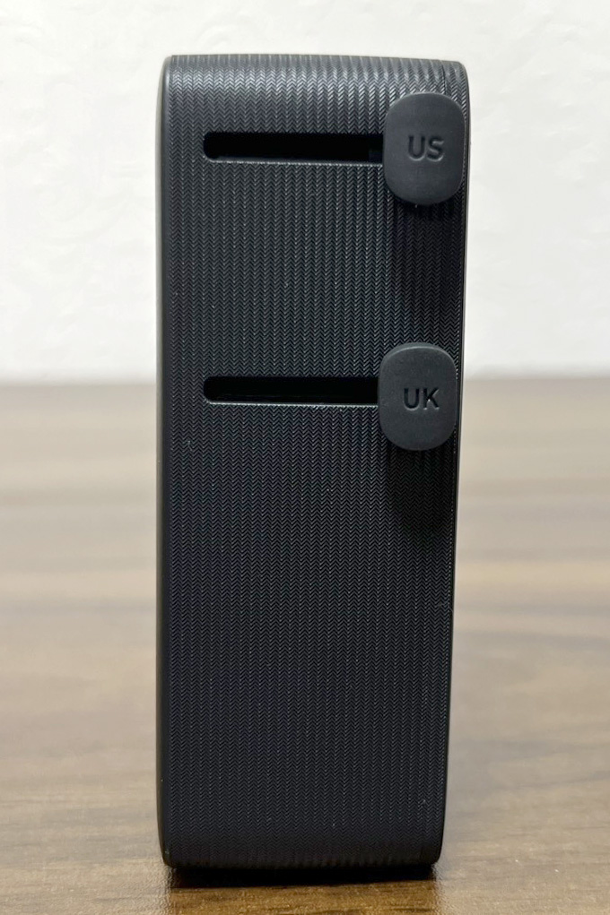 右側面。USプラグとUKプラグを引き出すためのスライダーが付いています。