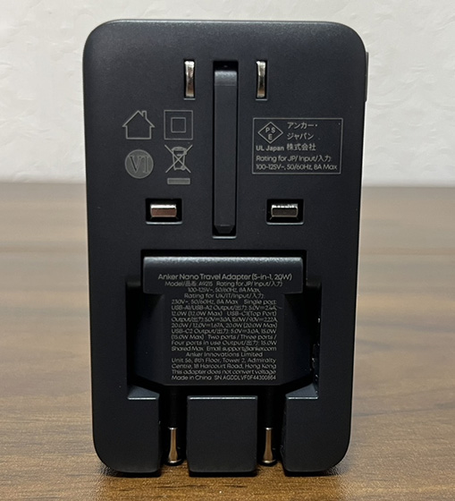 これが背面。200以上の国のプラグ形状に対応した3種類のプラグがコンパクトに収納されています。