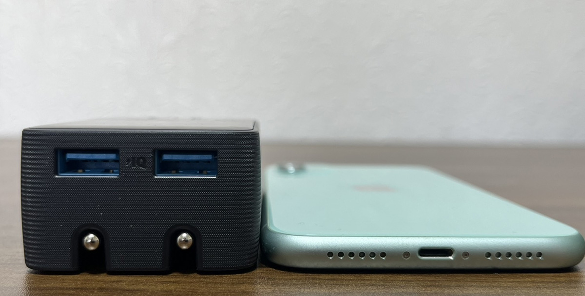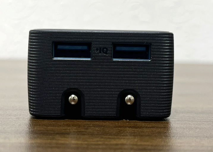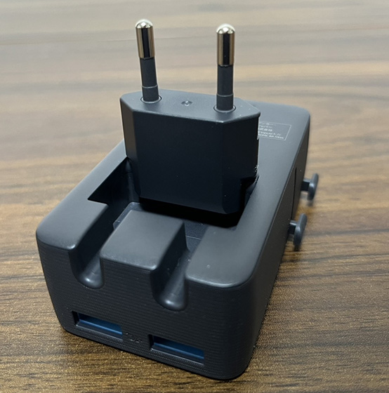 底面はこんな感じでUSB-Aポートが2つ配置されています。下に見えている金属部分は折り畳まれたEUプラグの先端部分。