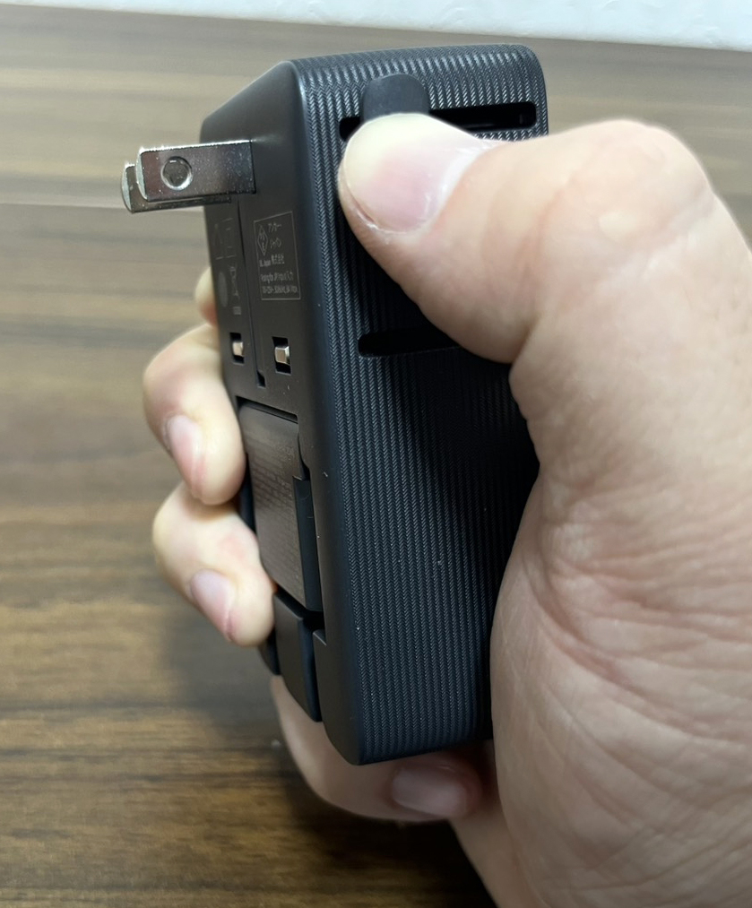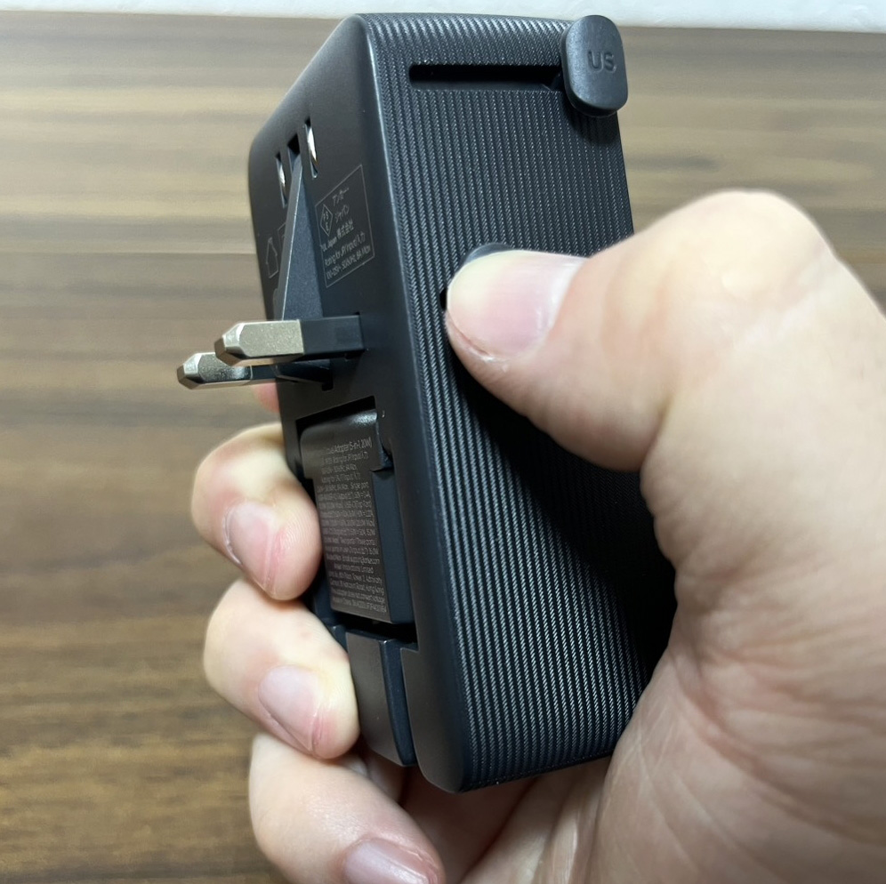 使い方は簡単。日本・アメリカ・中国・カナダなどに対応したAタイプのUSプラグは、本体右側面上部についている「US」と書かれたスライダーを押し込みながらスライドすると背面からニュッと出てきます。