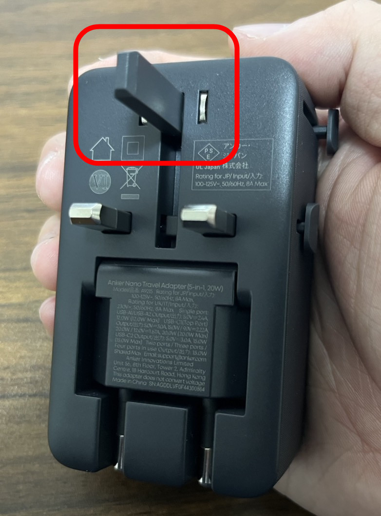 背面下部にあるEUプラグは、韓国・フランス・イタリア・スペインなどの国で使える「E/K/N/L/C/F/J」タイプに対応したプラグ。プラグの先端に指をかけて持ち上げればOKです。