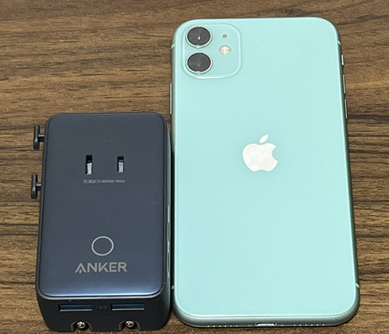 縦横のサイズは約86mm×51mmで、iPhone 11と並べてみるとこんな感じ。