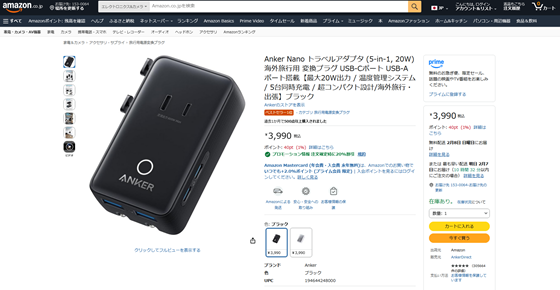 「Anker Nano トラベルアダプタ(5-in-1,20W)」はブラックとホワイトの2色が展開されており、公式サイトやAmazon.co.jpにて税込3990円で販売されています。
