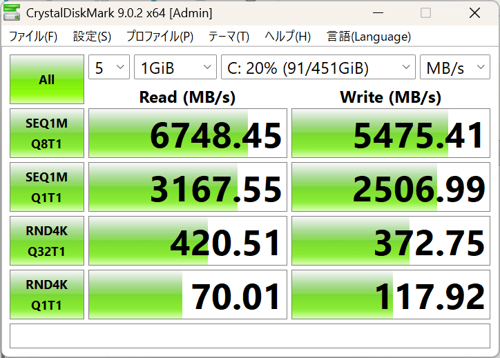 まずはCrystalDiskMarkでストレージの読み書き速度を測定。シーケンシャルリードが6748.45MB/s、シーケンシャルライトが5475.41MB/s、ランダムリードが420.51MB/s、ランダムライトが372.75MB/sとなりました。