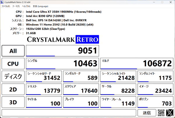 「CrystalMark Retro」を実行したところ、全体スコアは「9051」、CPUのシングルコアスコアは「10463」、マルチコアスコアは「106872」でした。