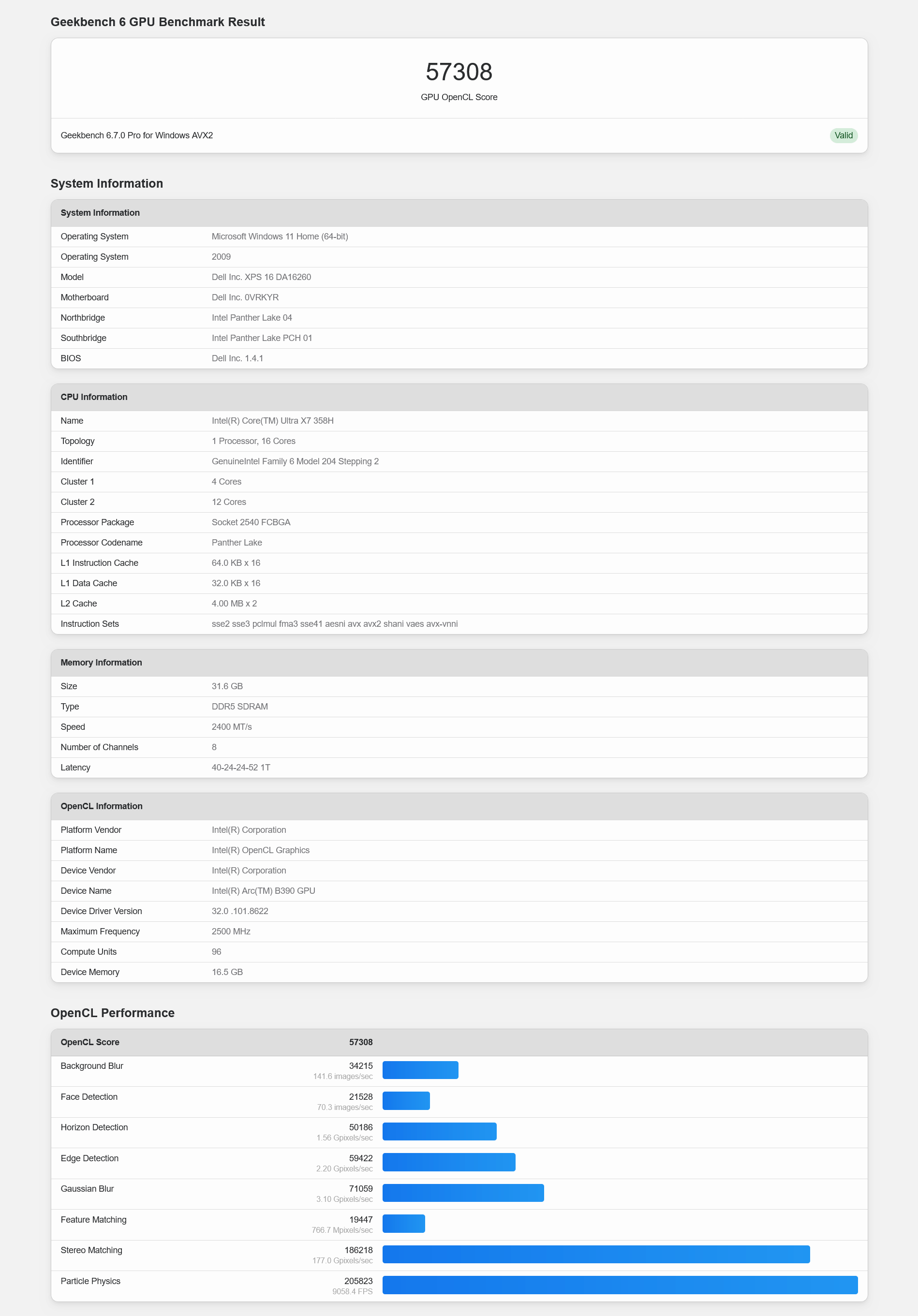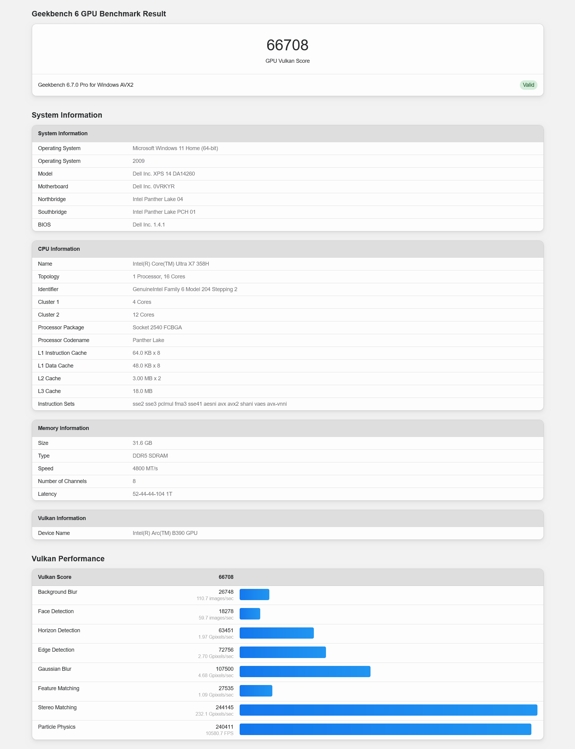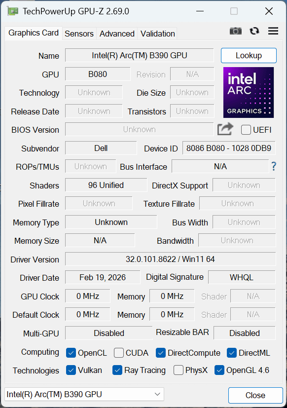 GPU-Z 2.69.0でチェックしたところ、グラフィックスはIntel Arc B390。基本的なスペック構成はXPS 14と同じです。