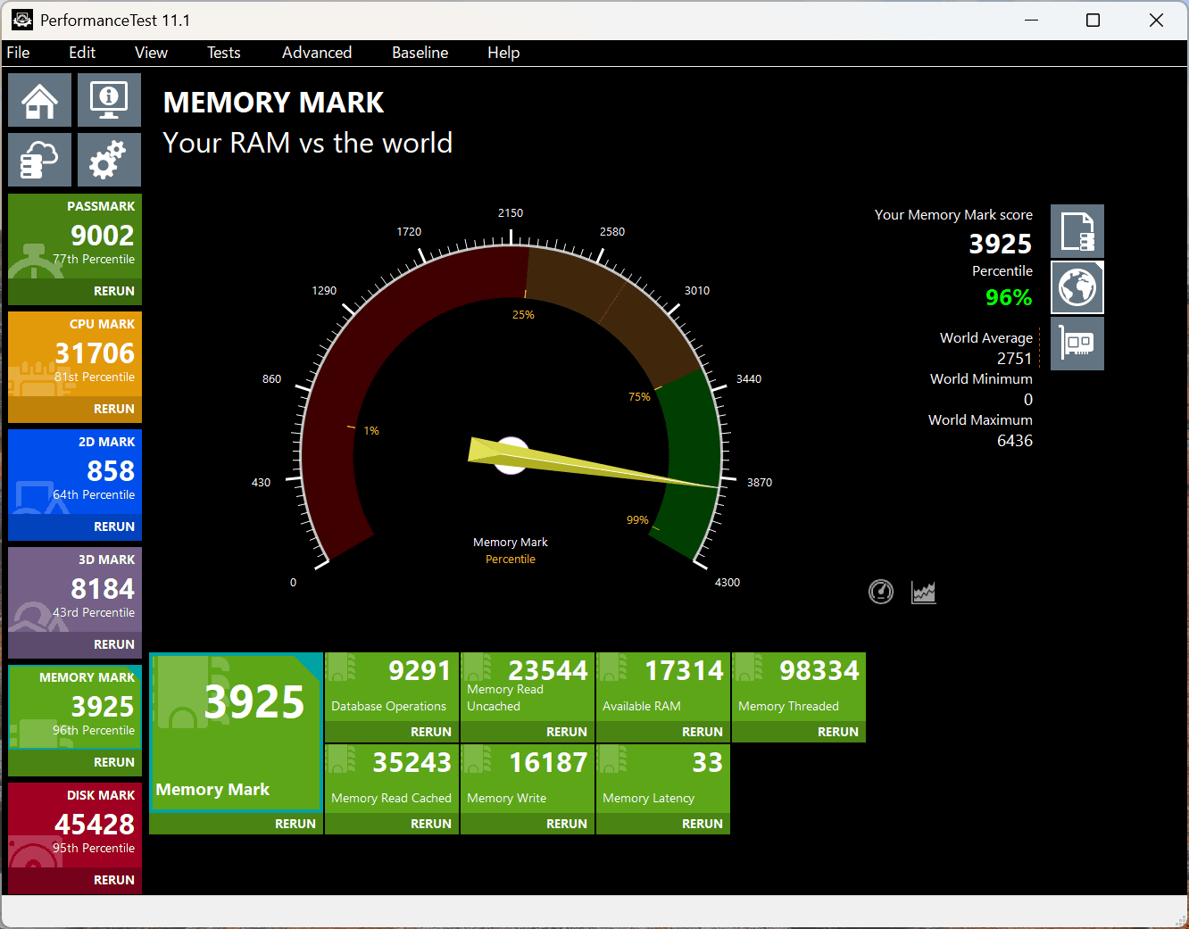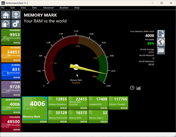 メモリーのスコアは「4006」で、パーセンタイルは98%。
