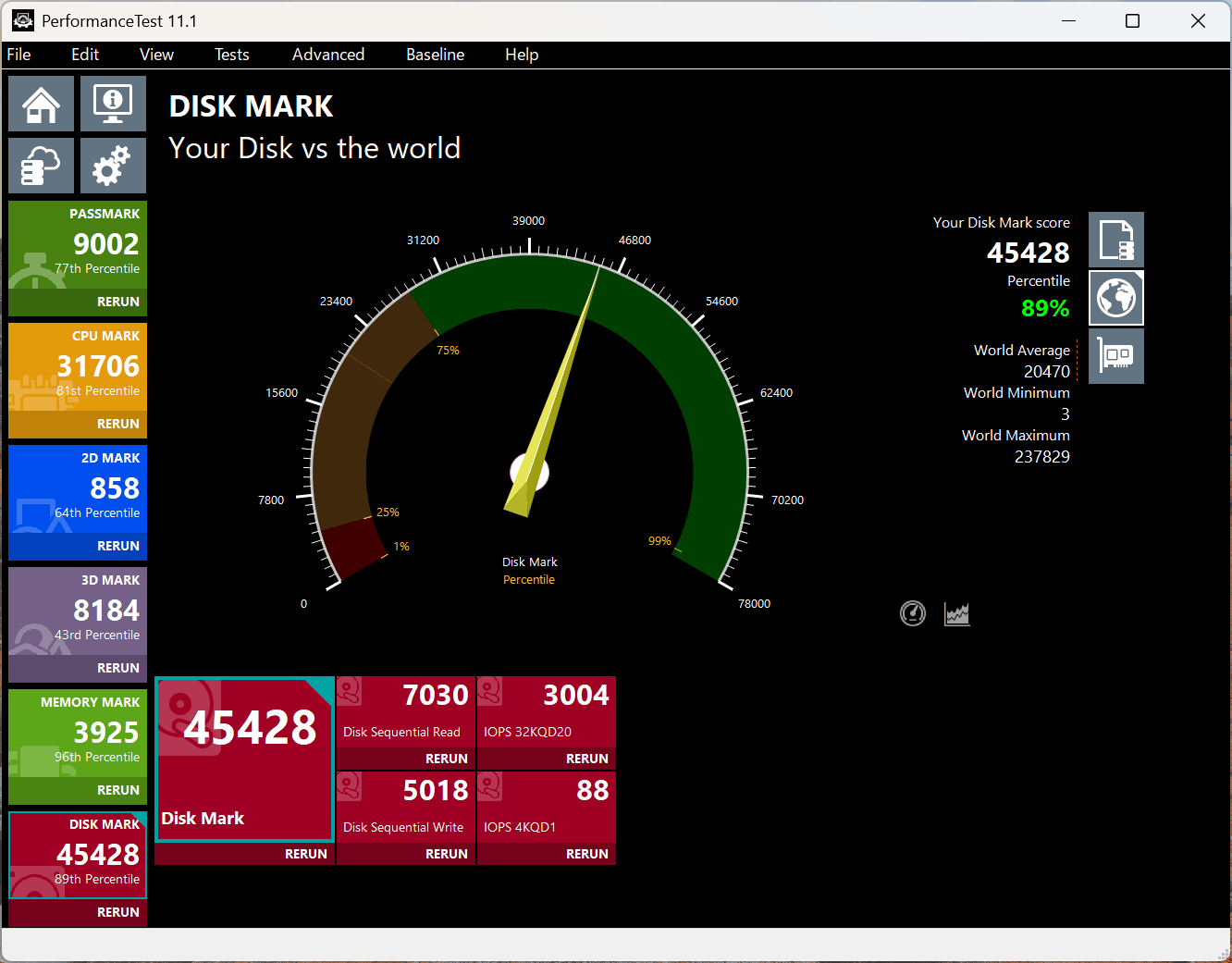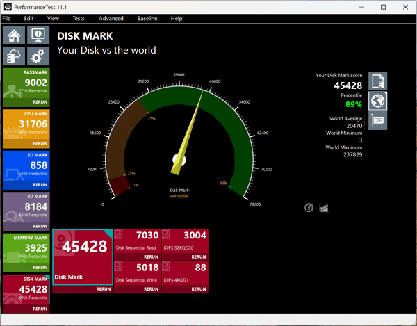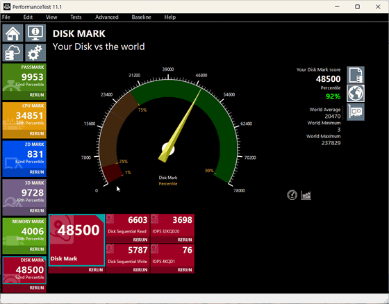Passmark Performance Test 11.1で測定した結果。XPS 16の総合スコアは「9953」で、世界中のユーザーが試行したベンチマークと比較するパーセンタイルは82%で、上位クラスの結果となりました。