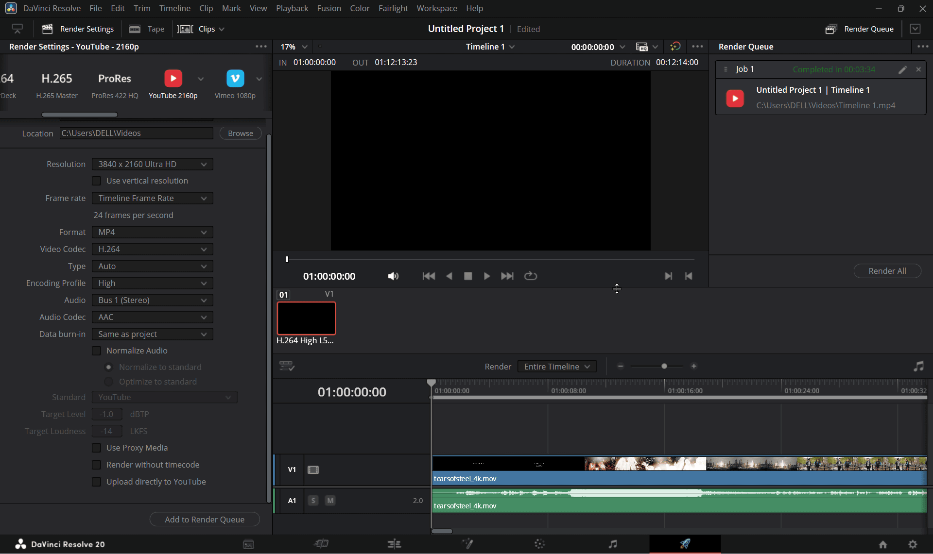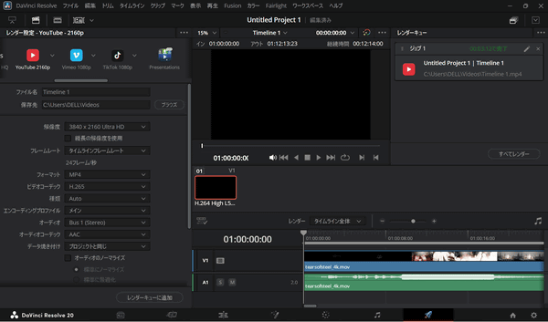 動画編集ソフトのDavinci Resolveで、Blenderのデモムービー「Tears of Steel」(3840×1714・24fps・8Bit・H.264/AVC・Apple QuickTime・再生時間12分14秒)をH.265でエンコードしてみたところ、書き出しにかかった時間は3分34秒でした。