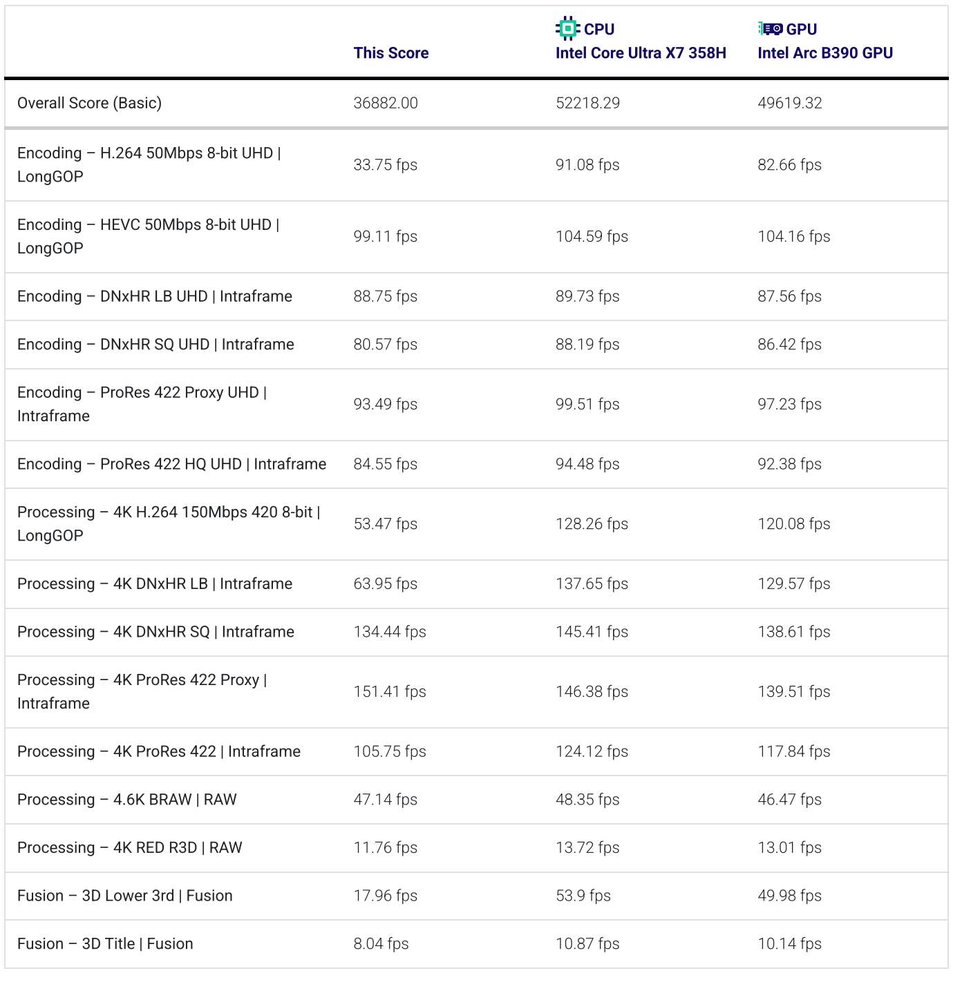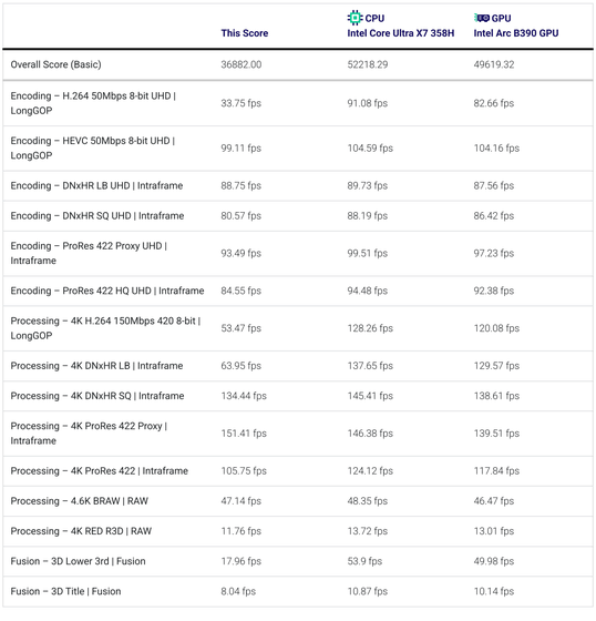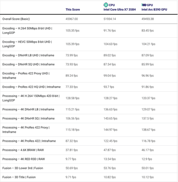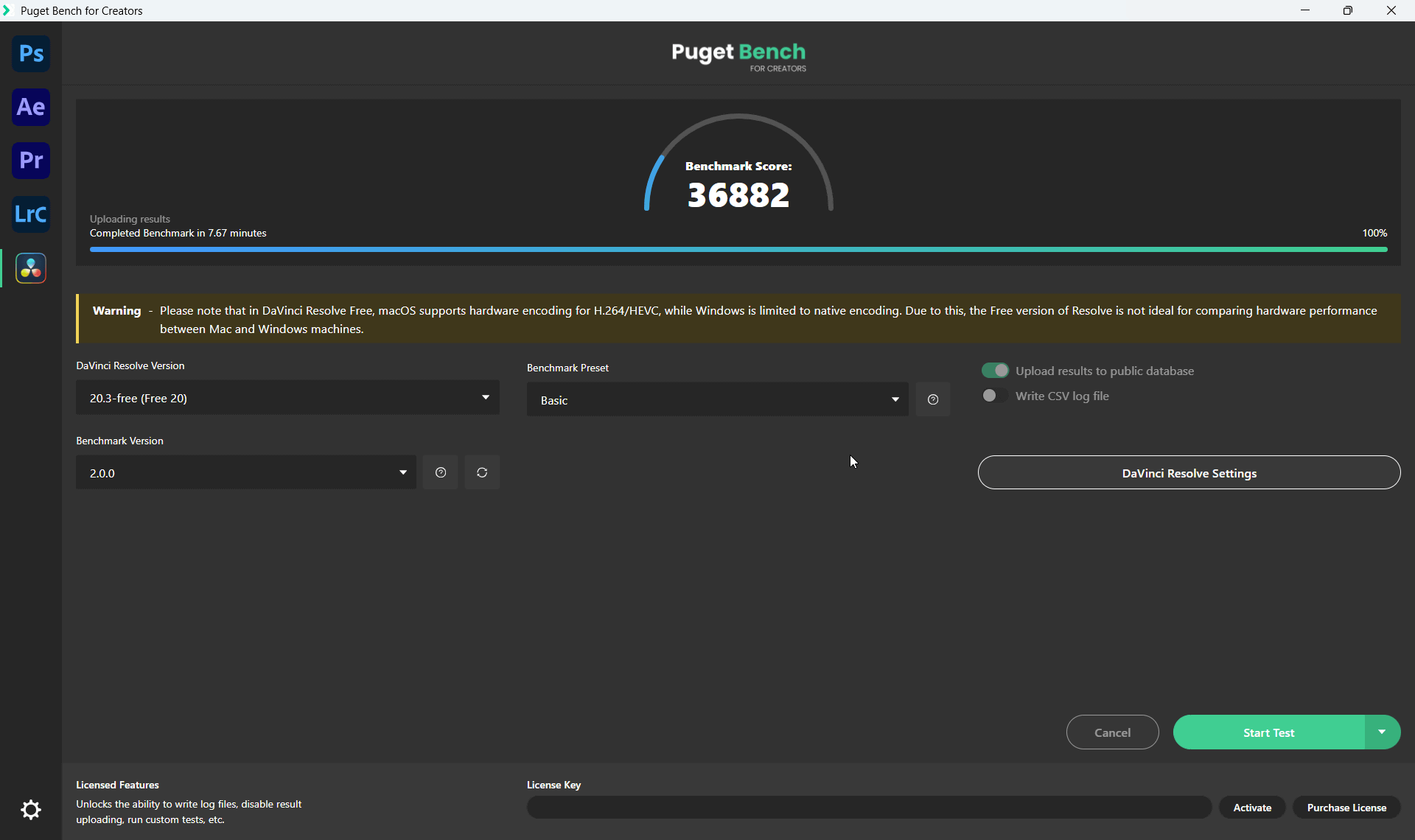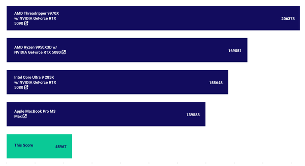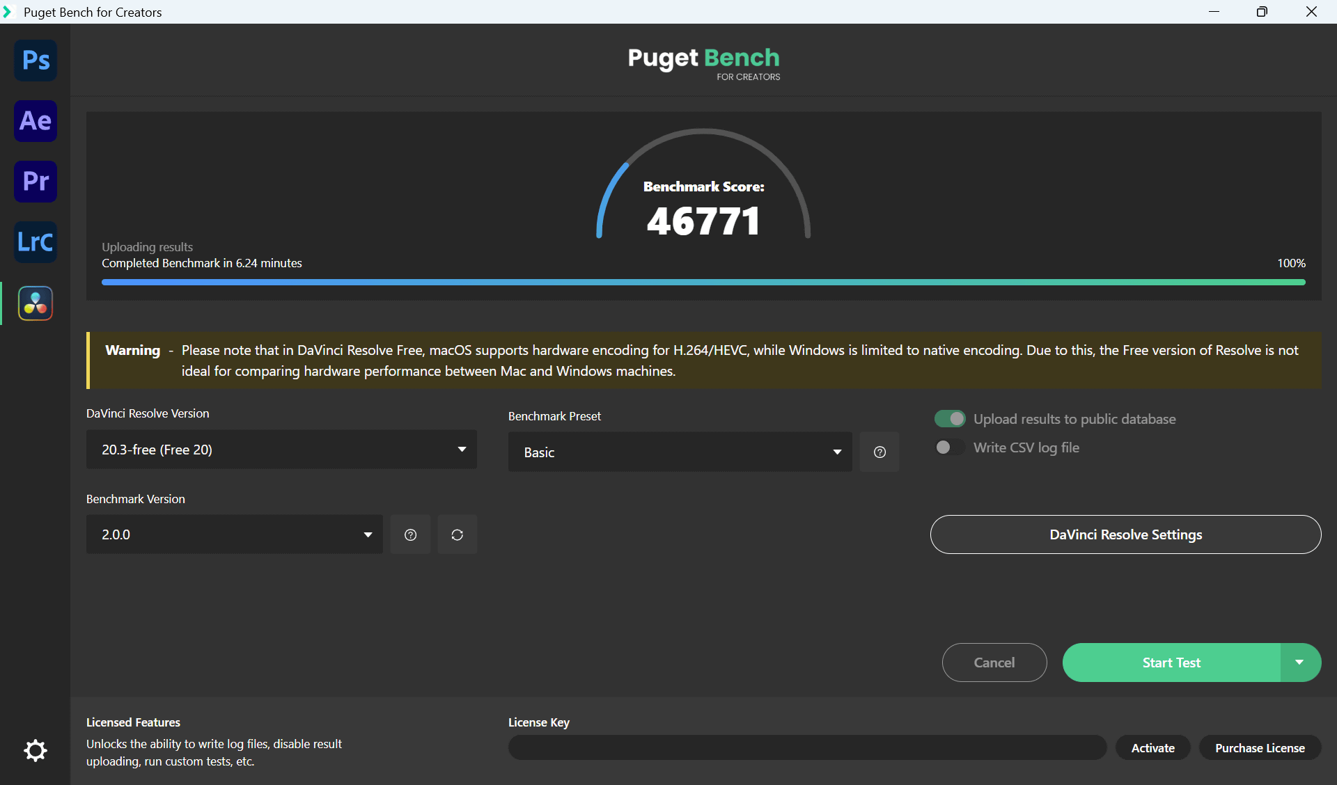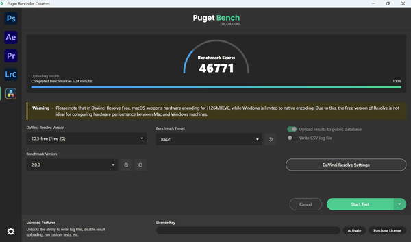 Davinci Resolveを使ったベンチマークツール「Puget Bench 2.0」でも測定してみました。スコアは46771。