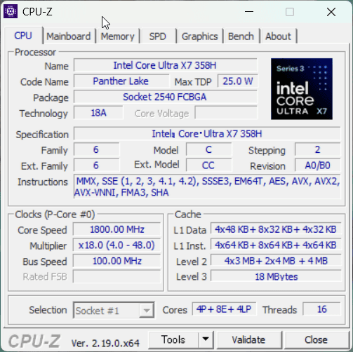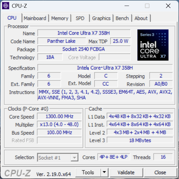 端末スペックの確認。「CPU-Z」によると、CPUはIntel Core Ultra X7 358Hで、16コア・16スレッドです。