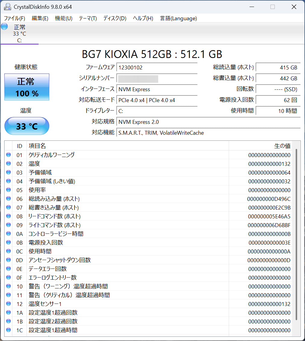 ストレージはPCI Express 4.0 x4接続のNVMe SSDで、容量は512GB。「CrystalDiskInfo」でチェックしたところ、キオクシア製のSSDが搭載されていました。