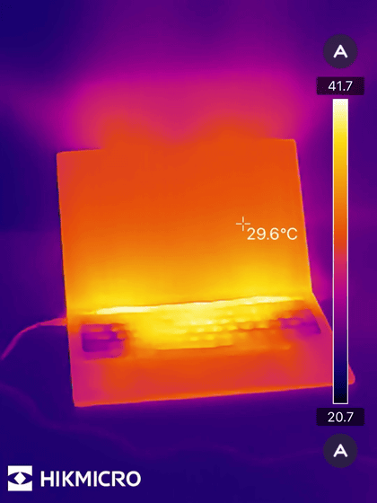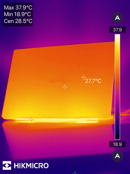 裏面を撮影。ヒンジの周辺で最高41℃なので、膝の上に乗せて使っていてもアチアチになってしまうということはなさげです。