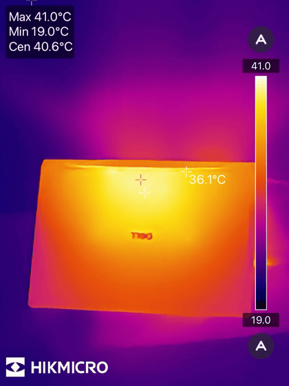 天面から撮影。ヒンジ下の排気ファン周辺で38℃ほどまで上がっていますが、高熱というほどではありません。
