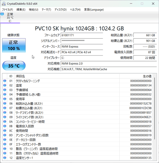 CryystalDiskInfo 9.8.0でストレージをチェック。SKハイニクス製のPCI Express 4.0 x4接続のNVMe SSDで、容量は1TB。