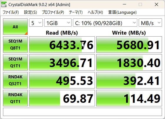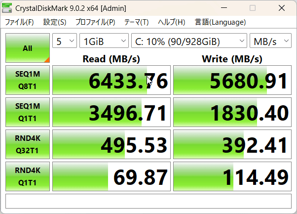 CrystalDiskMark 9.0.2でストレージの読み書き速度をチェック。シーケンシャルリードが6433.76MB/s、シーケンシャルライトが5680.91MB/s、ランダムリードが495.53MB/s、ランダムライトが392.41MB/sとなりました。