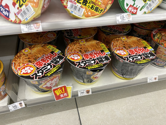 コンビニエンスストアのカップ麺コーナーで「でかまる バリシャキ! 辛もやしスタミナ醤油ラーメン」を発見。