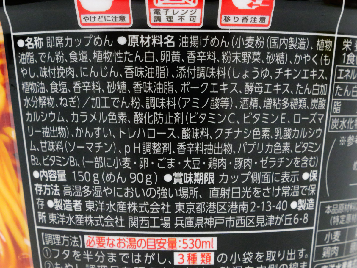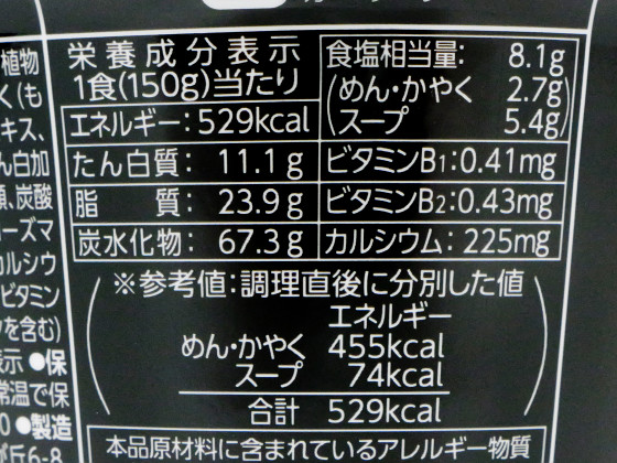カロリーは1食当たり529kcal。食塩相当量はめんとかやくが2.7gでスープが5.4gです。
