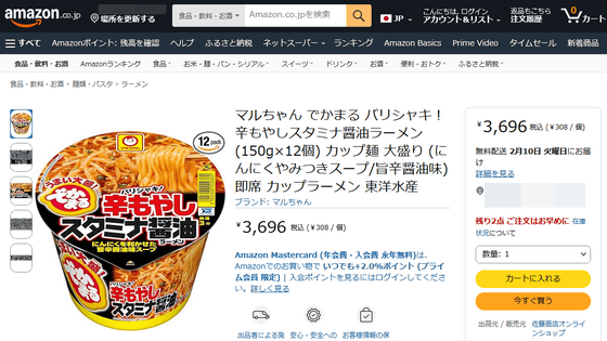 「でかまる バリシャキ! 辛もやしスタミナ醤油ラーメン」の希望小売価格は税別285円です。Amazon.co.jpでは12個セットを税込3696円(1個当たり308円)で入手できます。
