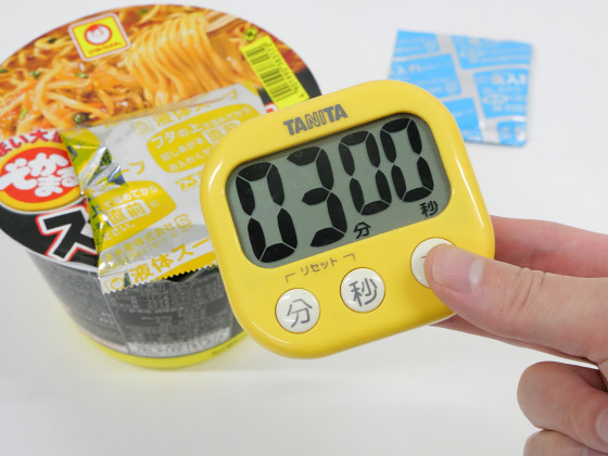 熱湯を注いで液体スープをフタの上で温めつつ3分待機します。