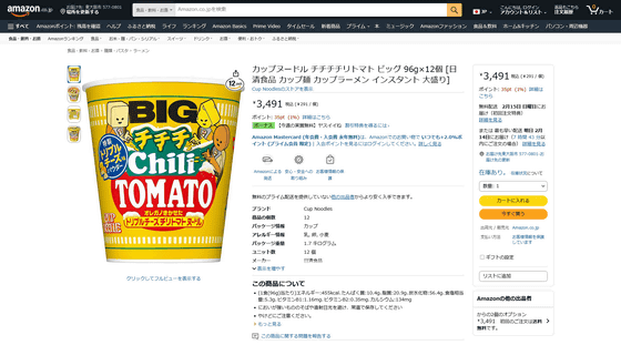 「カップヌードル チチチチリトマト ビッグ」の希望小売価格は税別271円(税込298円)。Amazonでは12個セットが税込3491円(1個あたり税込291円)で販売されていました。