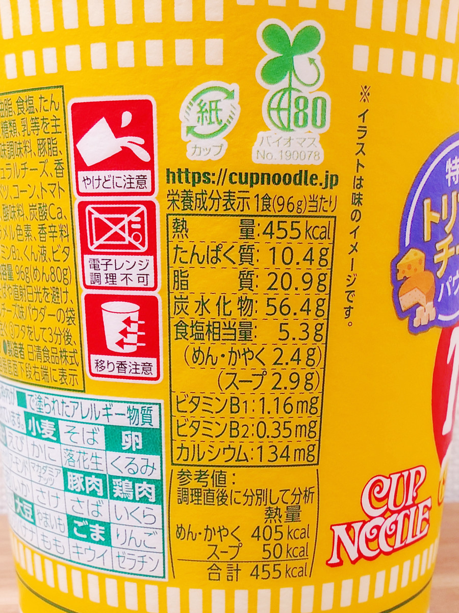 1食96gあたり455kcal。食塩相当量はめん・かやくが2.4g、スープが2.9gの合計5.3g。