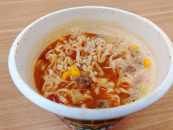 3分後、軽くまぜるとこんな感じ。この段階では赤いスープの「カップヌードル チリトマトヌードル」と大差ありません。
