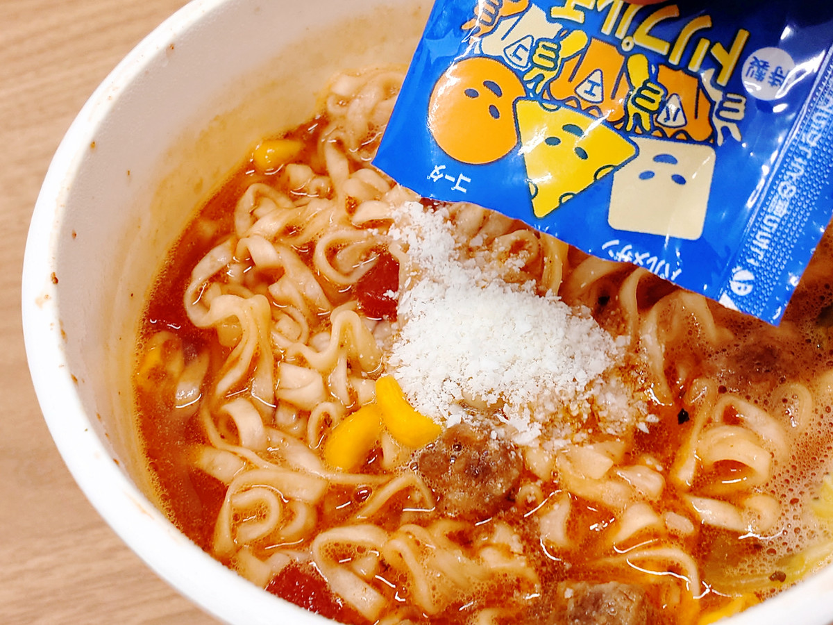 ノーマルの「カップヌードル チリトマトヌードル」はトマトらしい酸味が効いたパンチのある味わいですが、トリプルチーズが酸味をまろやかに包み込み、尖った部分をうまく丸めています。チーズといっても完全に粉末でスープに溶けてしまうので、とろっと伸びるようなところはまったくなく、食感への影響はゼロ。手間もかからずにひと味違う別のカップヌードルに化けたかのような感じ。味は麺との相性が抜群なほか、白飯とも合うので、リゾット的な食べ方もアリです。