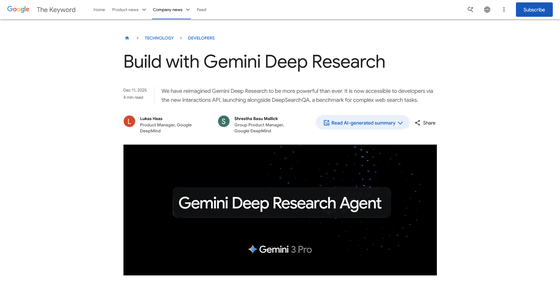 Googleが、「Gemini Deep Research」のウェブ検索能力を大幅に強化した「Gemini Deep Research エージェント」を、Interaction API経由で利用可能にすることを発表しました。また、ディープサーチエージェント評価用のベンチマーク「DeepSearchQA」のオープンソース化も行われています。