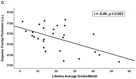 以下のグラフは縦軸が脳の血流を、横軸が1カ月あたりの飲酒量を示したもの。1カ月あたりの飲酒量が多い被験者ほど、脳の血流が少ないことがわかります。