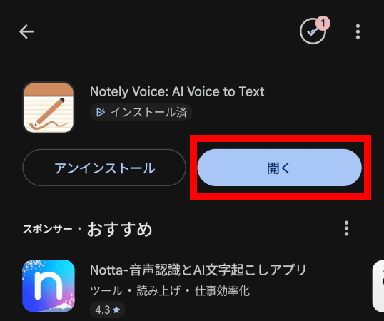 Notely VoiceはAndroid版iOS版があります。今回はAndroid版を使ってます。まず、Google PlayでNotely Voiceを探して「インストール」をタップ。