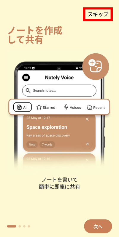 初回起動時はアプリの簡単な説明が表示されます。今回は「スキップ」をタップ。