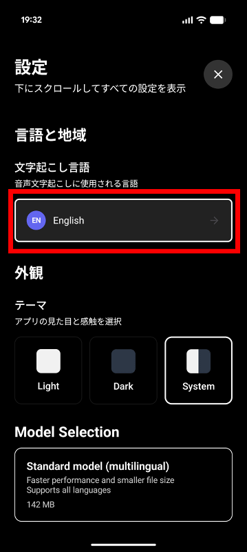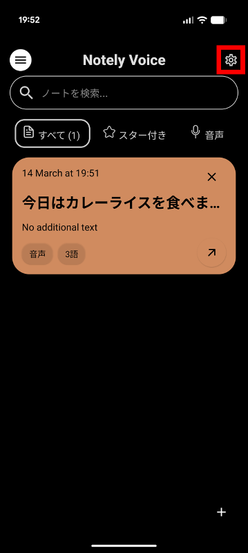 初期状態だと文字起こし言語が英語に設定されており、日本語の音声であっても自動的に英語に翻訳されてしまうので設定を変更します。まず、画面右上の設定ボタンをタップ。
