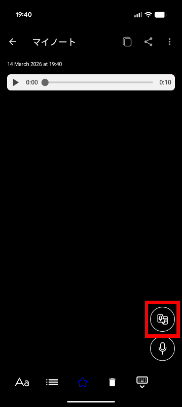 文字起こしするために右下の赤枠で囲ったボタンをタップします。
