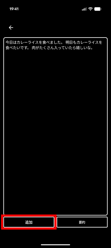 ダウンロード完了後に自動的に文字起こし処理が実行されました。左下の「追加」をタップ。