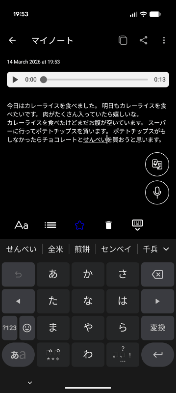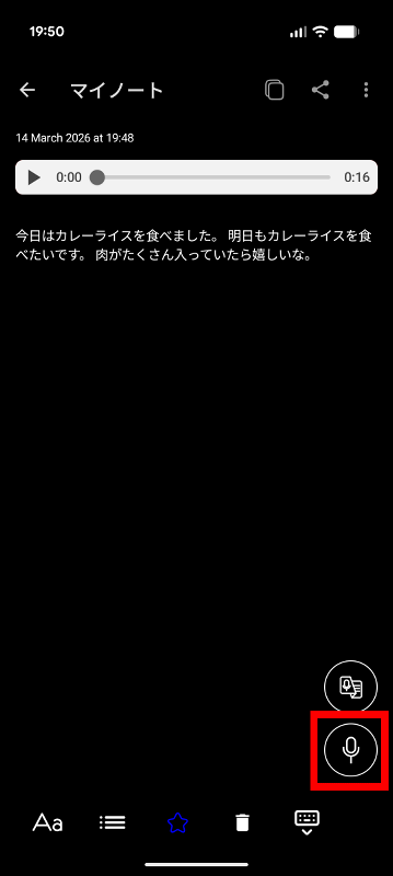 メモの内容を追加するべく右下の録音ボタンをタップ。