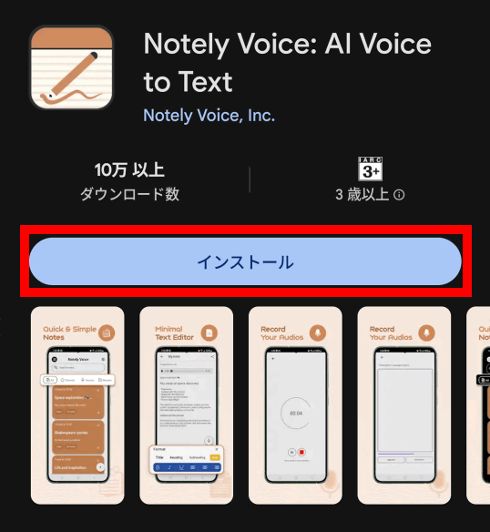 Notely VoiceはAndroid版iOS版があります。今回はAndroid版を使ってます。まず、Google PlayでNotely Voiceを探して「インストール」をタップ。