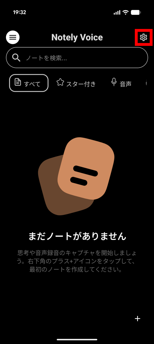 初期状態だと文字起こし言語が英語に設定されており、日本語の音声であっても自動的に英語に翻訳されてしまうので設定を変更します。まず、画面右上の設定ボタンをタップ。