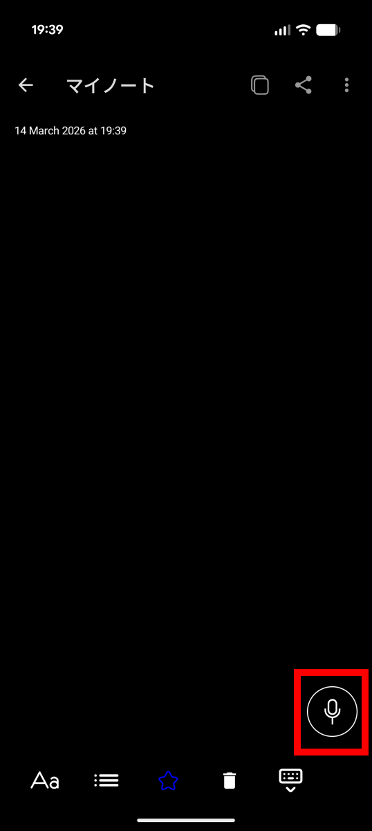 それでは、メモを作成してみます。まず、右下の録音ボタンをタップ。