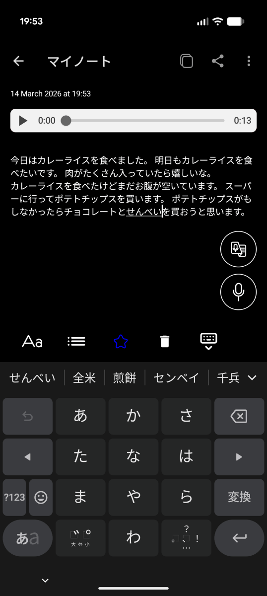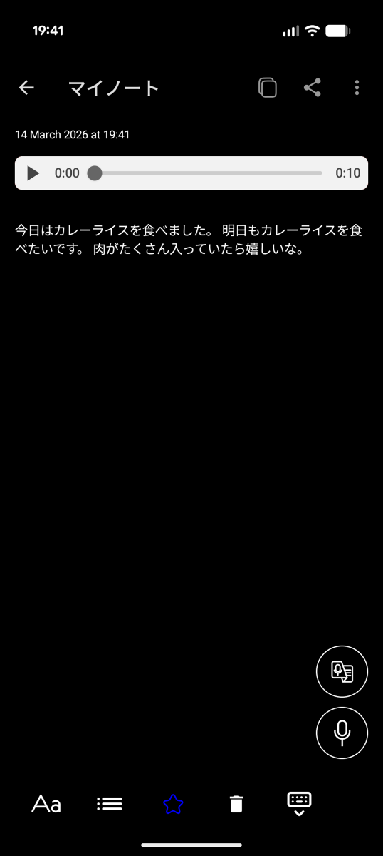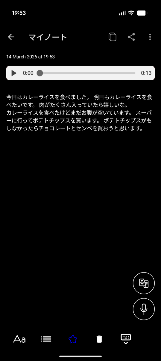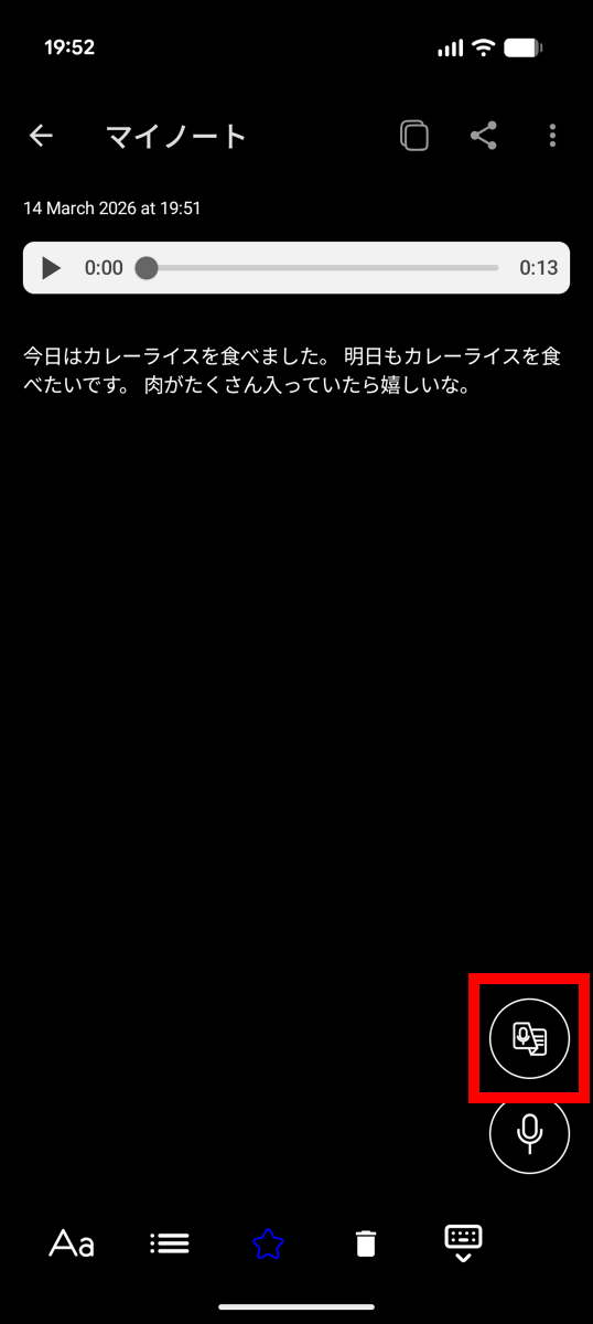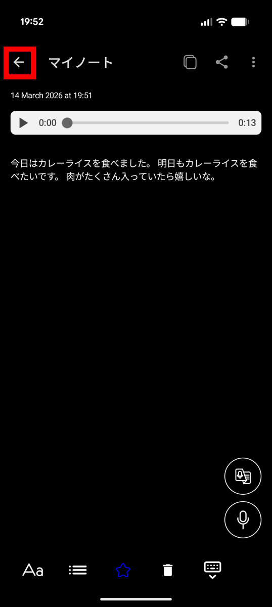 メモの内容を追加するべく右下の録音ボタンをタップ。