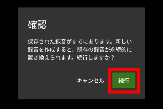 「すでに録音済みのデータが上書きされる」という内容の確認画面が表示されたら「続行」をタップ。