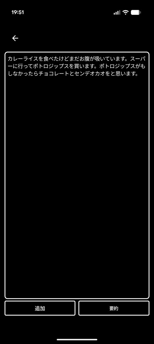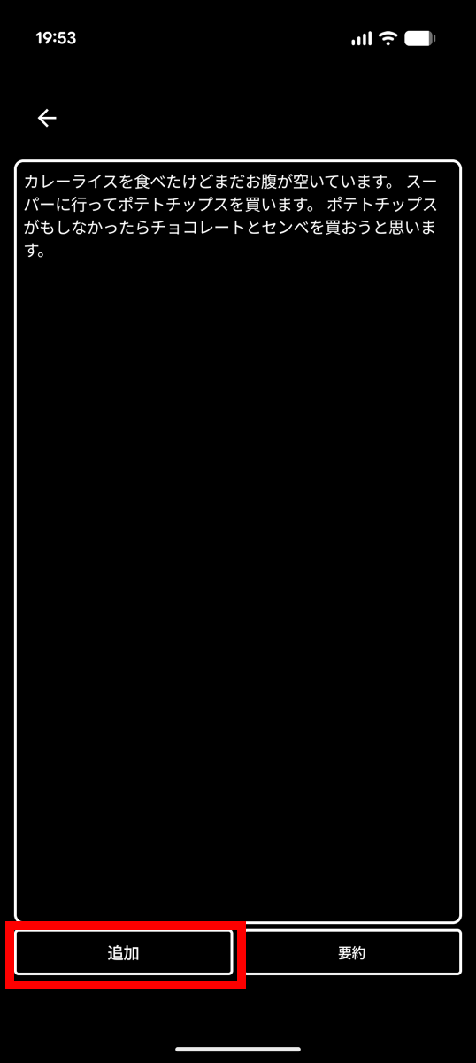 ダウンロード完了後に自動的に文字起こし処理が実行されました。左下の「追加」をタップ。