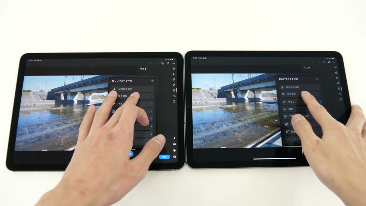しかし、いろいろ試している中で、Adobe Photoshopにおいて第4世代iPad Airのみ「メモリ(RAM)が足りません」と表示されることがありました。AppleはRAM容量を公開していませんが、Geekbench 5によれば両者には倍の開きがあるとのことなので、使い方によってはその差を実感できるタイミングがある様子です。