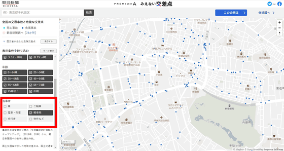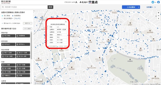地図を新宿駅周辺にズームしてみました。大量に打たれている青い点は、警察庁が公開した68万件の人身事故データのうち、負傷事故が起こったポイント。カーソルを点に重ねると、負傷者・当事者・損傷・当事者らの年齢などの情報が表示されます。