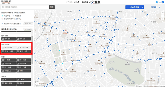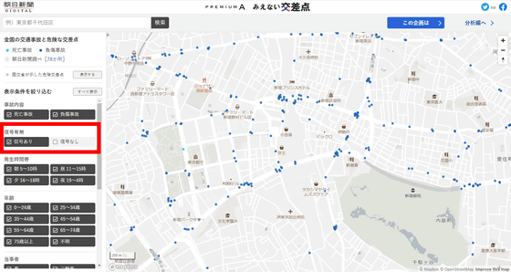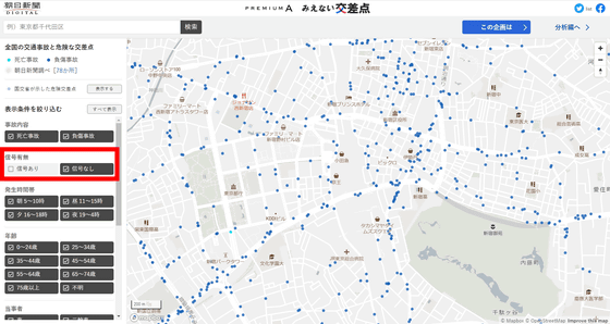 左カラムでは、表示する人身事故発生ポイントの条件を調整することができます。例えば、信号のある場所での事故だけを表示したところが以下。