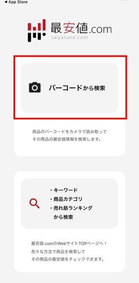 「最安値.com」を起動すると、こんな感じの画面が表示されます。上記のようなバーコードを利用した一発検索を行うには、「バーコードから検索」をタップします。