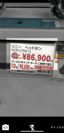 すると、カメラが起動します。後は、カメラで目当ての商品のバーコードを撮影するだけで最安値を検索できます。例えば、ヘッドホンの値札に付いたバーコードをスキャンすると……