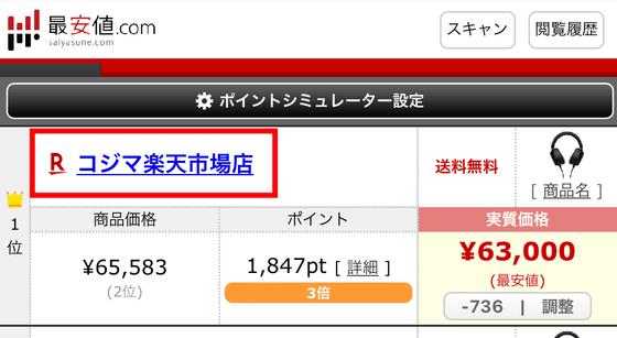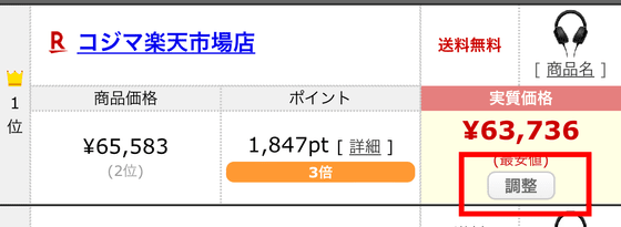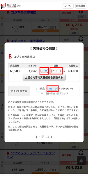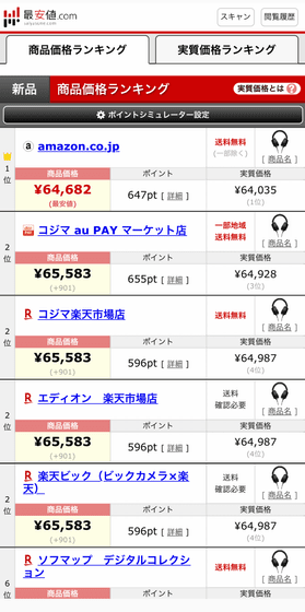 すると設定が商品価格ランキングに反映され、楽天市場のポイント欄に獲得可能なポイントが表示されました。さらにその右隣には表示価格からポイント獲得分を引いた「実質価格」も表示されています。設定反映前はAmazon.co.jpが「6万4682円」で最安値でしたが、楽天カードを利用する設定を反映した場合は楽天市場の価格が1847円分安くなって「実質6万3736円」となり、Amazon.co.jpより946円分お得になることが判明しました。